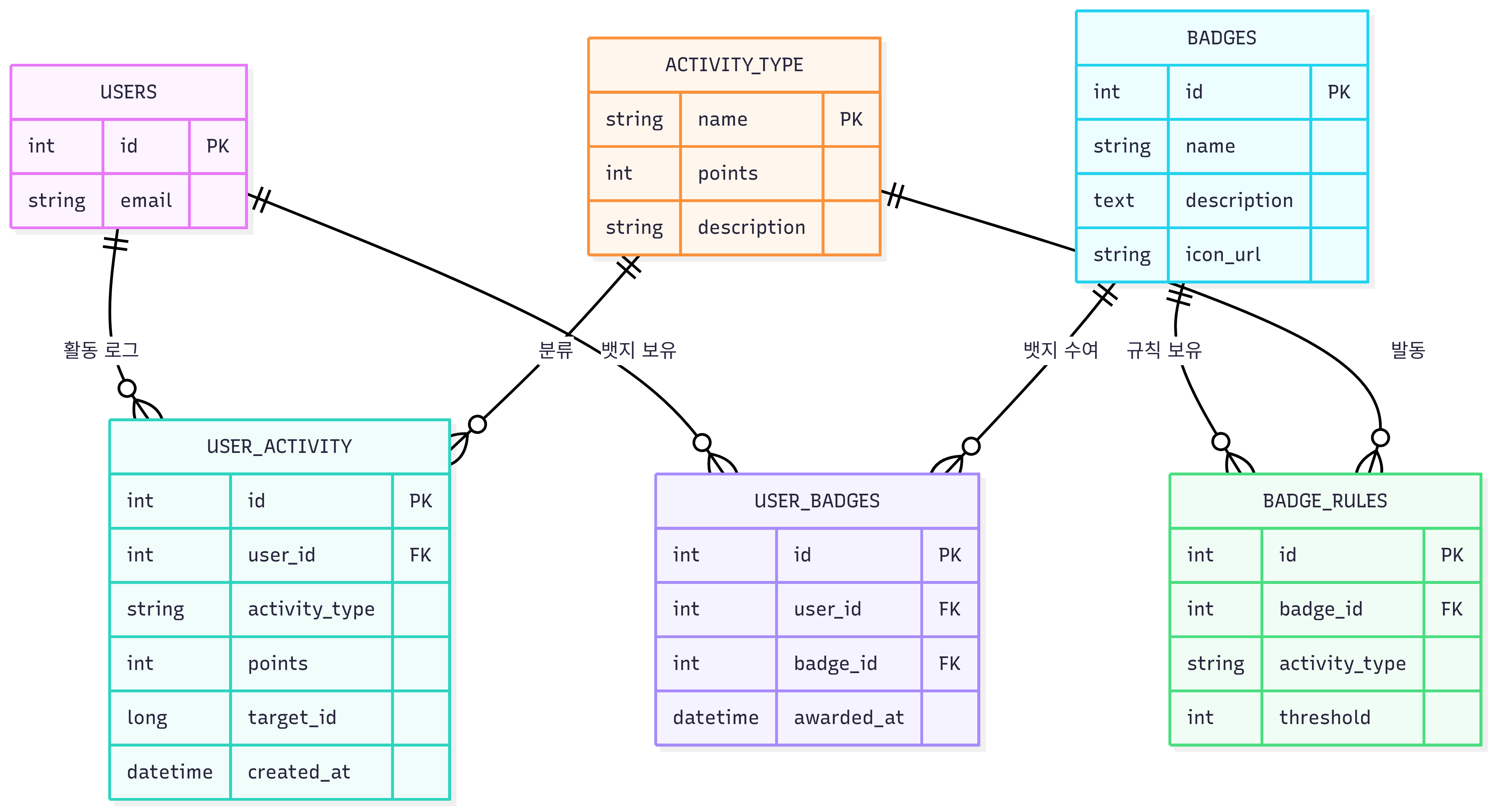 - USER_BADGES: 실제 수여된 뱃지 기록