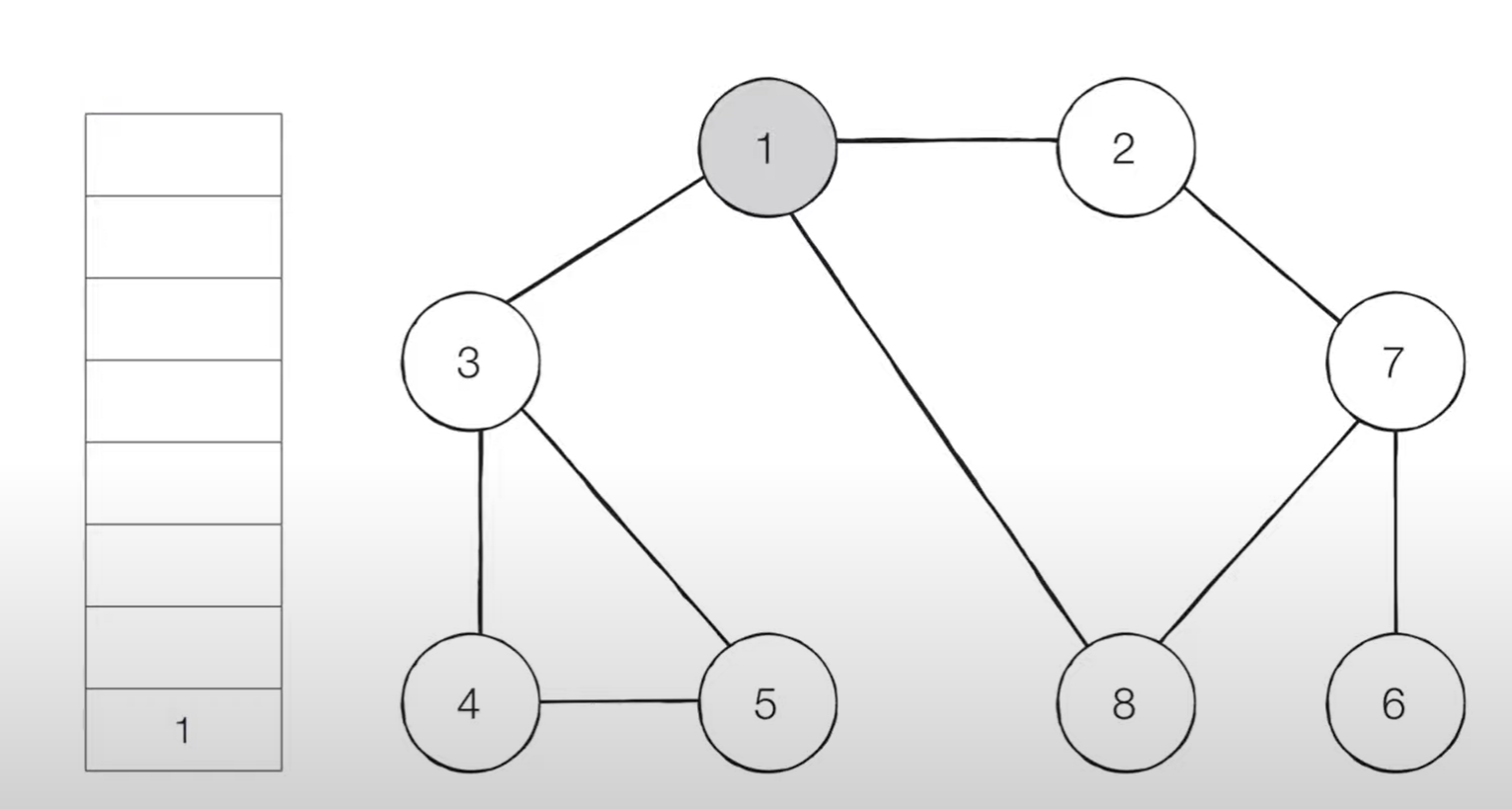 - [Step 2] 큐에서 노드 '1'을 꺼내 방문하지 않은 인접 노드 '2', '3', '8'을 큐에 삽입하고 방문 처리합니다.