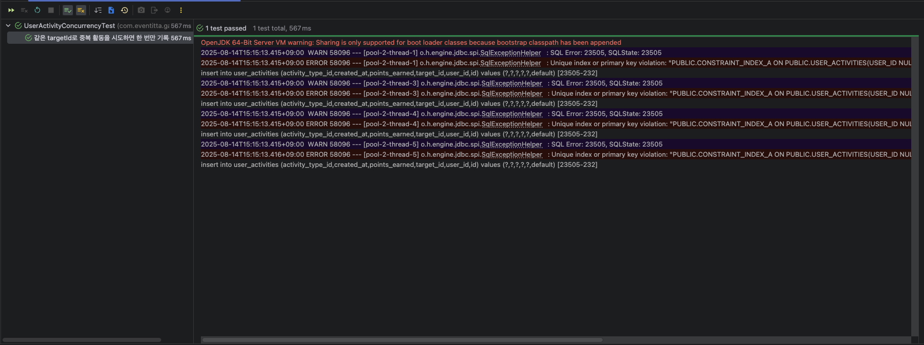 2025-08-14T15:15:13.415+09:00 ERROR 58096 --- [pool-2-thread-4] o.h.engine.jdbc.spi.SqlExceptionHelper : Unique index or primary key violation: "PUBLIC.CONSTRAINT_INDEX_A ON PUBLIC.USER_ACTIVITIES(USER_ID NULLS FIRST, ACTIVITY_TYPE_ID NULLS FIRST, TARGET_ID NULLS FIRST) VALUES ( /* key:4 */ CAST(1 AS BIGINT), CAST(1 AS BIGINT), CAST(100 AS BIGINT))"; SQL statement: